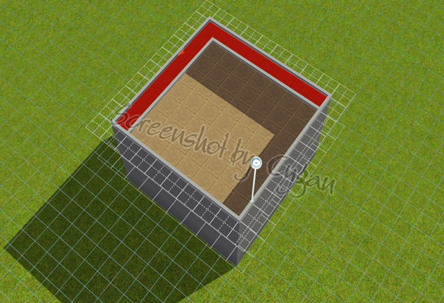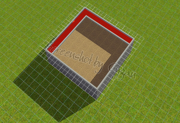 der an zwei Seiten ein Kästchen Abstand zum „Außenraum“ hat. Zur besseren Darstellung habe ich den Boden gefärbt. In dem rot gefärbten Bereich wird später der überschüssige Berg verschwinden.